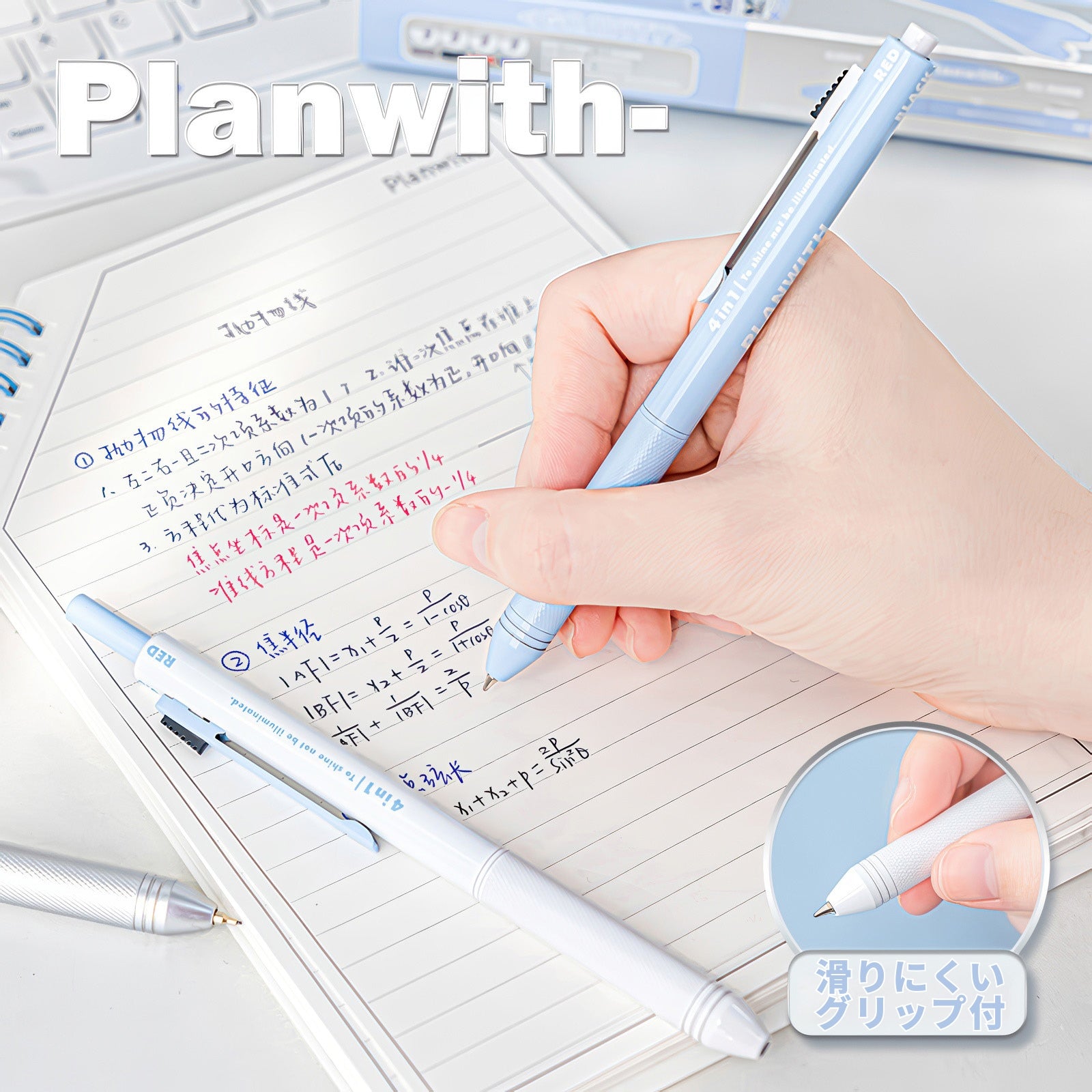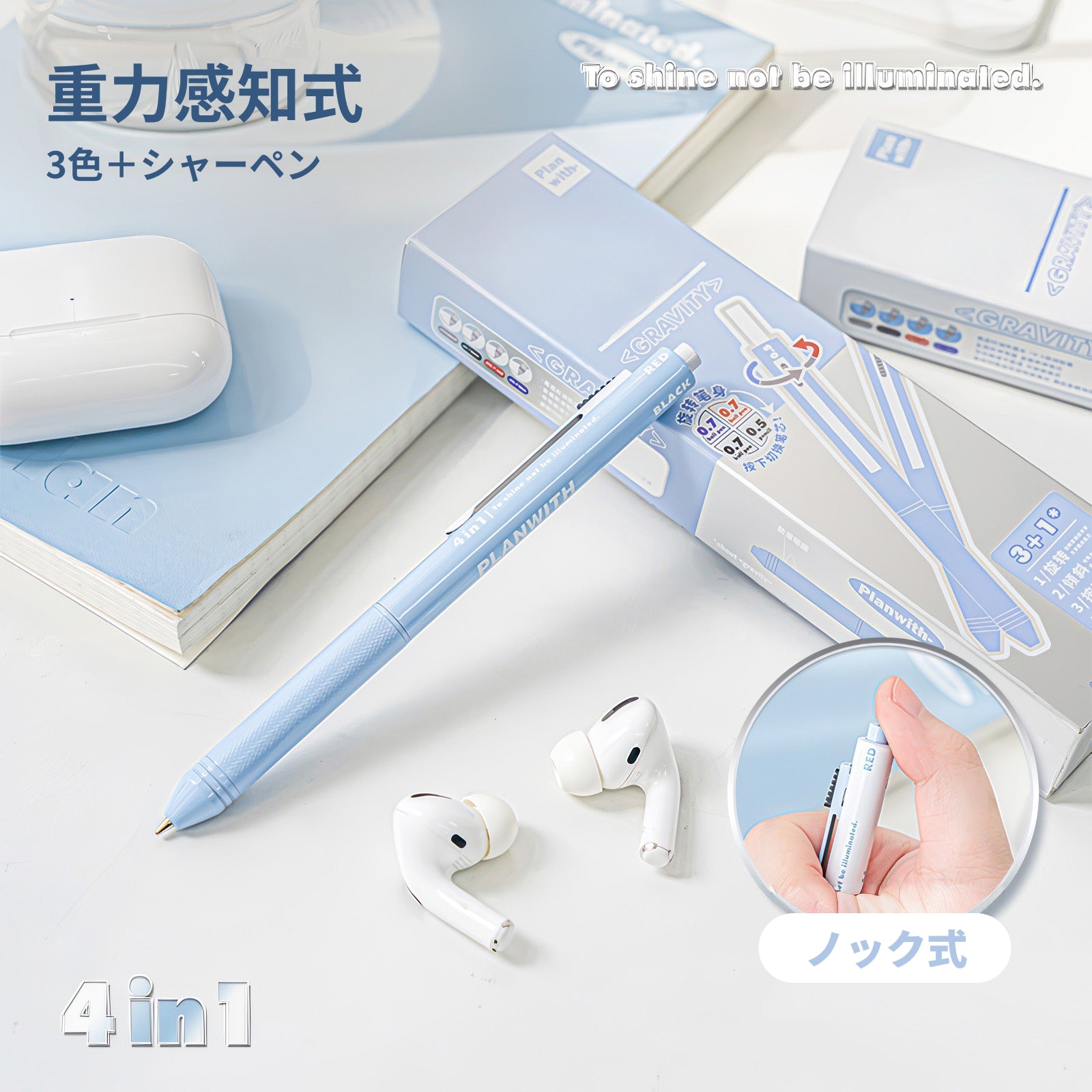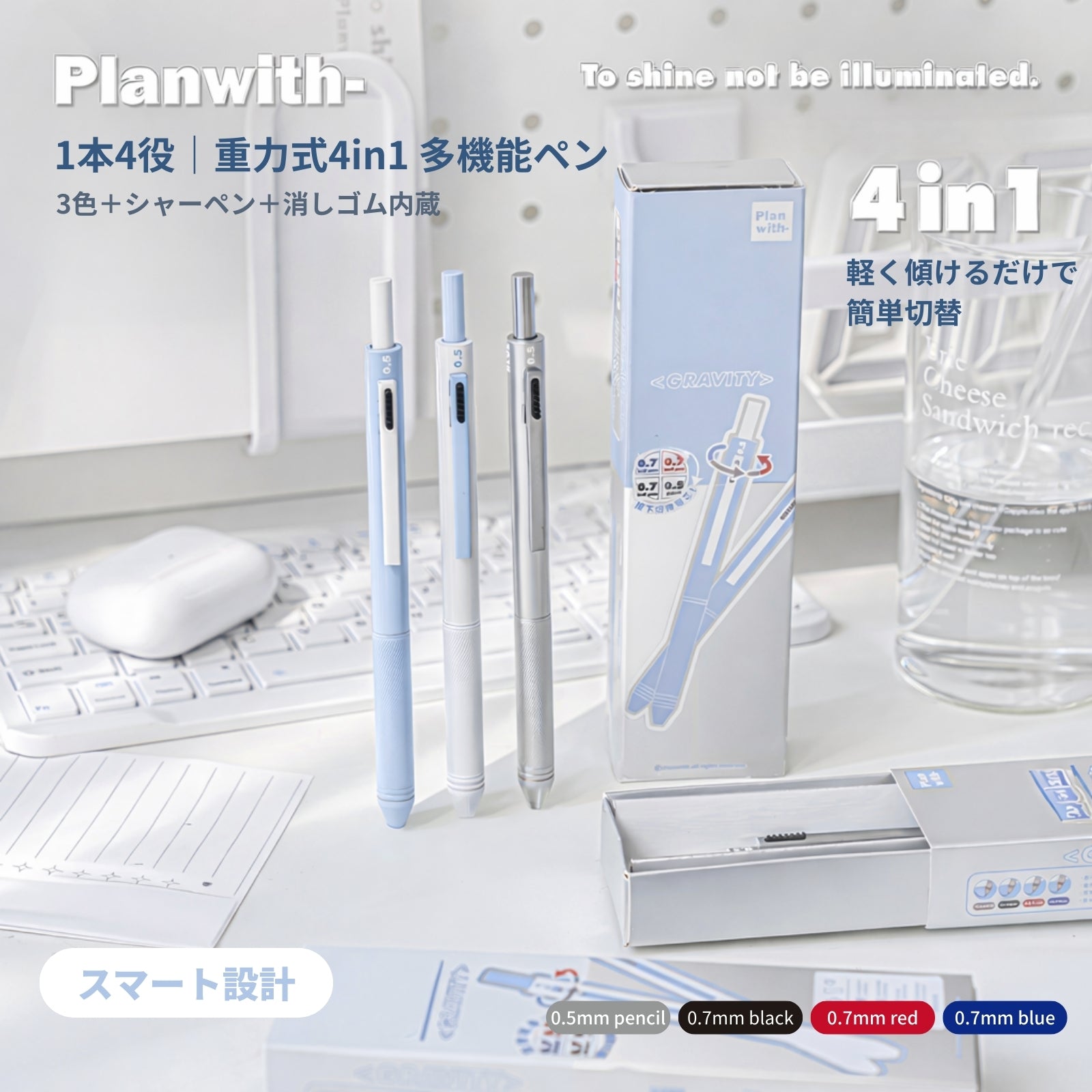 Planwithの「1本4役|重力式4in1 多機能ペン」は、日常使いから勉強、ビジネスシーンまで幅広く活躍する多機能ペンです。